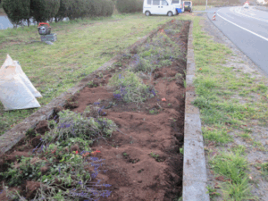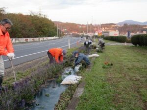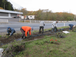 気仙沼地方労福協は、環境保全活動の一環と“地域に顔の見える活動”として、気仙沼市「花のみち45」の取組みに参加しています。今年6月に植栽した花壇の花々も、「花じまい」の季節となり、11月16日の一斉作業日に合わせ実施しました。花を抜き取り、根回りの土を落とし、ビニールマルチを丁寧にはがした後、来年の花のための肥料を撒きました。抜いた花々は機械で粉砕し肥料として再活用されることを知り、無駄の無い、環境保全につながる活動であることをあらためて実感しました。早朝からの作業でしたが、市内各自治会、団体等の皆さんとも声を掛け合いながら実施しました。